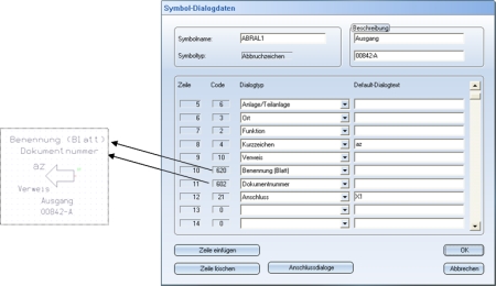 Ein Abbruchzeichen-Symbol kann Schriftfeld-Dialogtexte des Blattes, auf dem das Partnersymbol liegt, in seine Datenmaske übernehmen und damit auch als Grafiktext anzeigen.
