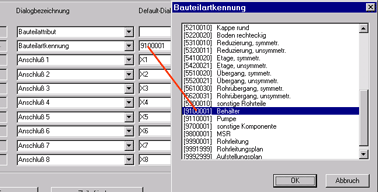 Klicken Sie in der Zeile des Dialogtyps Bauteilartkennung in das Eingabefeld in der Spalte Default-Dialogtext. Daraufhin wird die unten abgebildete Auswahlliste eingeblendet. Wählen Sie die geeignete Bauteilart aus. Der zugehörige Zahlenschlüssel wird dann in das Eingabefeld übernommen. Wenn Sie die Auswahlliste erneut sehen wollen, müssen sie zuvor in ein anderes Eingabefeld geklickt haben.