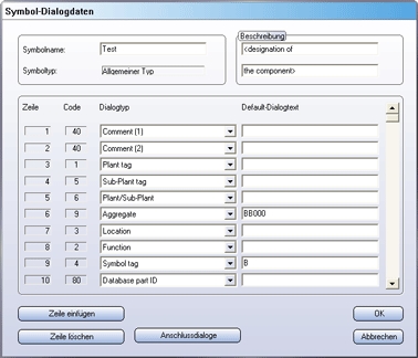 Mit dieser Funktion blenden Sie die Datenmaske des Bibliothekssymbols ein. Für ein neu angelegtes Symbol ist sie zunächst leer. Nicht belegte Zeilen sind am Dialogtyp 0 erkennbar. Im Allgemeinen werden Sie jedoch nicht mit einer leeren Maske beginnen, sondern sich die Datenmaske eines bereits vorhandenen Symbols laden. Daher ist hier eine Datenmaske abgebildet, die nicht leer ist: