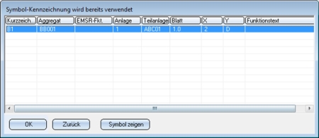 Wird eine nicht eindeutige Kennzeichnung eingegeben, werden in einer Dialogbox die Symbole aufgelistet, die schon gleiche Kennzeichnung tragen.