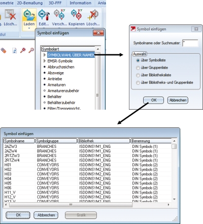 Die Listen zur Auswahl eines Symbols, einer Symbolgruppe, oder einer Bibliothek zeigen zusätzlich zum Namen der Bibliothek nun auch ihre Benennung an, vorausgesetzt, die Bibliothek wurde über die Datenbank verwaltet, als sie in das R+I Projekt eingebunden wurde. In der Spalte Benennung steht dann das Dokumentenattribut der Bibliotheks-Stammdaten.