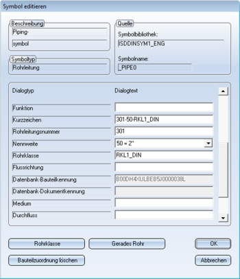 Der Dialog zum Editieren eines Rohrleitungssymbols sieht, wenn dem Symbol eine Rohrklasse zugeordnet ist, wie folgt aus: