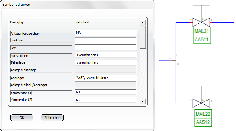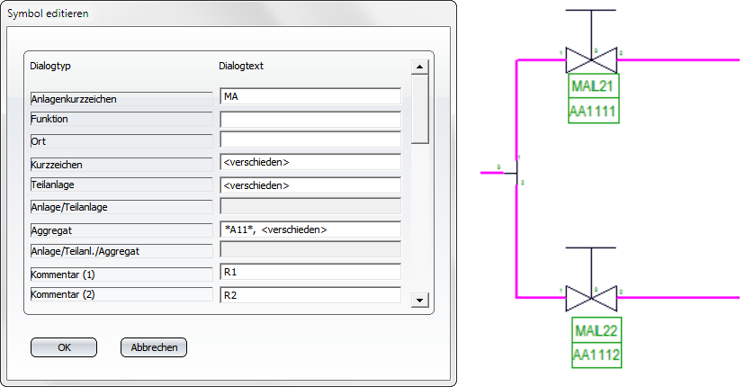 Die Daten der Symbole werden in der Dialogbox Symbol editieren zusammengefasst. Steht <verschieden> in der Spalte Dialogtext, bedeutet das, dass die Werte für diesen Dialogtyp bei den ausgewählten Symbolen unterschiedlich sind.