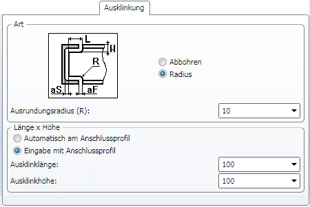 Als Ausklinkungsarten stehen Abbohren oder Radius zur Verfügung. Wählen Sie die gewünschte Option und geben Sie den Ausrundungsradius ein. |