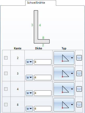 Sollen an den Profilkanten des angeschlossenen Profils Schweißnähte eingefügt werden, dann aktivieren Sie die Registerkarte Schweißnähte.