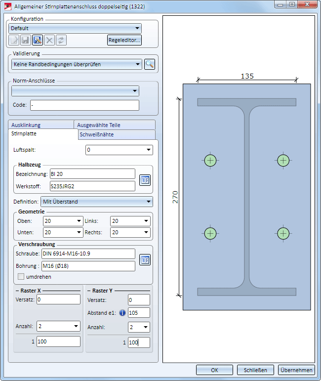Andockfenster Bauwesen-Funktionen > Stahlbau > Anschlüsse > Stirnseite an Steg-/Flanschseite > Stirnplatte > Allgemeiner Stirnplattenanschluss doppelseitig (1322)