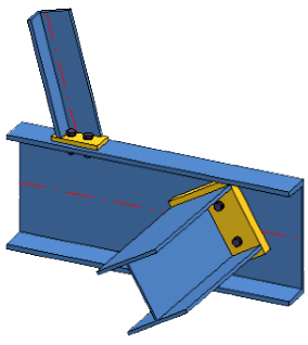 Mit dieser Funktion schließen Sie zwei Profile mit geschraubten Stirnplattenanschlüssen - mit oder ohne Steifen - an ein drittes Profil an. Der Anschluss kann dabei sowohl an Steg als auch an Flansch erfolgen. Je nach Einbausituation werden die angeschlossenen Profile automatisch ausgeklinkt. Darüber hinaus lassen sich auf Wunsch auch direkt die Schweißnähte einfügen und beschriften.