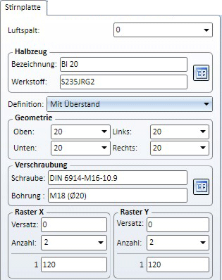 Halbzeug Die Platte kann sowohl aus Blech als auch aus Flachstahl bestehen. Durch einen Klick auf das Symbol Soll das Profil, an das die Platte angeschlossen wird, um die Plattendicke gekürzt werden, dann aktivieren Sie die Checkbox Profil um Plattendicke kürzen. |