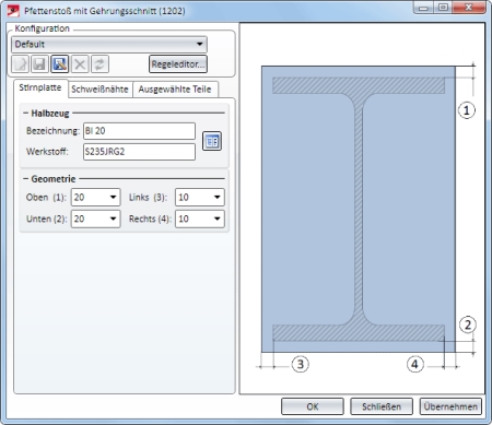 Andockfenster Bauwesen-Funktionen > Stahlbau > Anschlüsse > Stirnseite an Stirnseite > Stirnplatte > Pfettenstoß mit Gehrungsschnitt (1202)