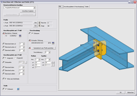 Hier werden zwei Profile durch zwei Bleche und - falls gewünscht - eine Steife miteinander verbunden. Die verlängerten Achsen der beiden Profile müssen sich schneiden.