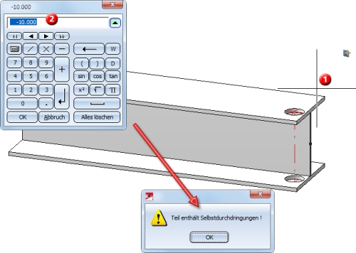 Deshalb schlägt ein Verlängern/Verkürzen beispielsweise fehl, wenn das Profil "in eine Bohrung" verkürzt werden soll (siehe Abbildung).
