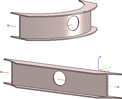 Gekrümmte Stahlbauträger lassen sich mit dieser Funktion abwickeln. Dies wird im Featureprotokoll (ähnlich wie bei der Biegesimulation im Blech) festgehalten. Bearbeitungen werden exakt mit abgewickelt. Beachten Sie aber, dass z. B. kreisrunde Bearbeitungen in der Abwicklung nicht mehr kreisrund bleiben.