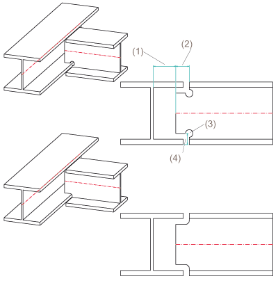 Sie können zwischen automatischer und manueller Eingabe von Länge und Höhe der Ausklinkung wählen. Bei der automatischen Ermittlung werden nach der DASt-Richtlinie genormte minimal mögliche Werte für Höhe und Länge - unter Berücksichtigung des eingegebenen minimalen Flanschabstandes - gewählt. Folgende Optionen stehen zur Verfügung: