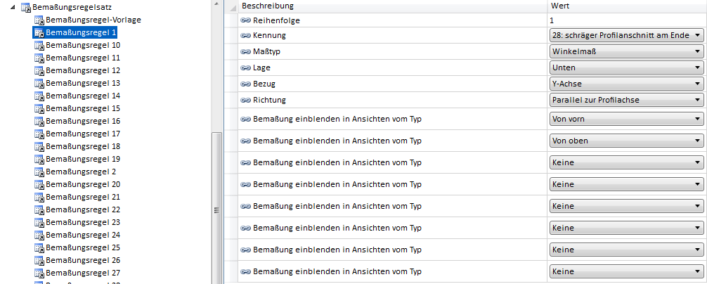 Die Definition der Bemaßungsregeln für einen Verwendungszweck erfolgt unter ..> Automatische Zeichnungsableitung > Verwendungszweckabhängig > NAME > Bemaßungsregelsatz, wobei NAME der Name des jeweiligen Verwendungszwecks ist, also z.B. RAILING.