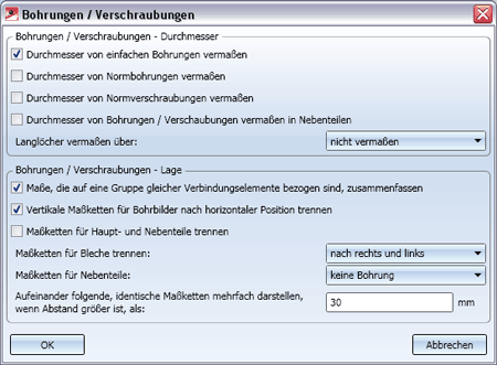 Darüber hinaus können Sie hier die Lage der Maße von Bohrungen/Verschraubungen beeinflussen, z.B. ob Maßketten für Haupt- und Nebenteile getrennt werden sollen u.v.m.
