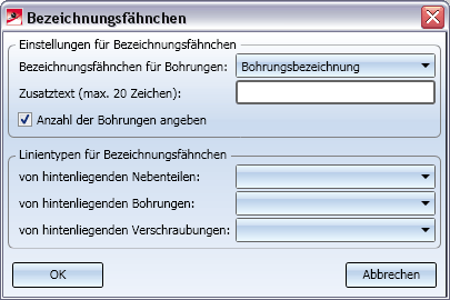 In unteren Teil des Dialogfensters haben Sie die Möglichkeit, für hintenliegende Nebenteile, Bohrungen oder Verschraubungen einen anderen Linientyp für die Bezeichnungsfahne zu wählen.