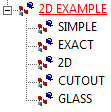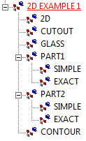 - Besteht das 2D-Modell aus mehreren Hauptteilen, dann dürfen die Teile GLASS, CUTOUT, und CONTOUR nicht auf derselben Ebene wie die Teile SIMPLE und EXACT liegen, sondern müssen derselben Ebene wie die Hauptteile liegen.
