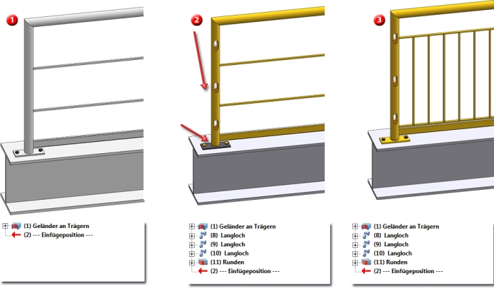 Die Abbildung zeigt den Ausschnitt eines mit dem Geländerkonfigurator erzeugtenGeländes (1). An diesme Geländer wurden manuelle Änderungen (2) vorgenommen. In den Pfosten wurden Bohrung eingefügt und das Pfostenende wurde gerundet. Anschließend wurde das Geländer mit dem Geländerkonfigurator bearbeitet, um eine andere Füllung (3) zu wählen. Dabei sind die manuellen Änderungen erhalten geblieben.