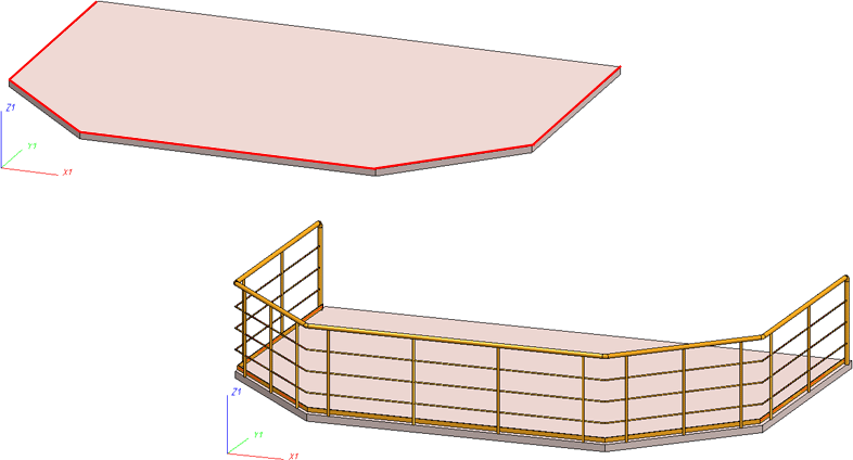Oben: 3D-Solid mit ausgewählten Kanten, Unten: Erzeugtes Geländer