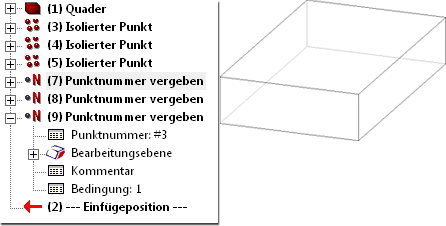 Um einem isolierten Punkt eine Punktnummer, d.h. eine Bezeichnung zuzuweisen, verwenden Sie die Funktion Punktnummer neu auf der Registerkarte 3D-Standard unter Tools > Punkte neu . Identifizieren Sie dann nacheinander die zuvor bestimmten isolierten Punkte und geben Sie zunächst als Punktbezeichnung die Namen P1, P2 bzw. P3 ein. Für jede Punktbezeichnung wird ein entsprechendes Feature in das Feature-Protokoll eingetragen.