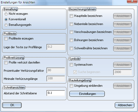 Hier legen Sie die Darstellung der Ansichten fest, beispielsweise die Art der Bemaßung, die Ausgabe der Bezeichnungsfahnen, die Darstellung der Bauteilumgebung u.v.m.