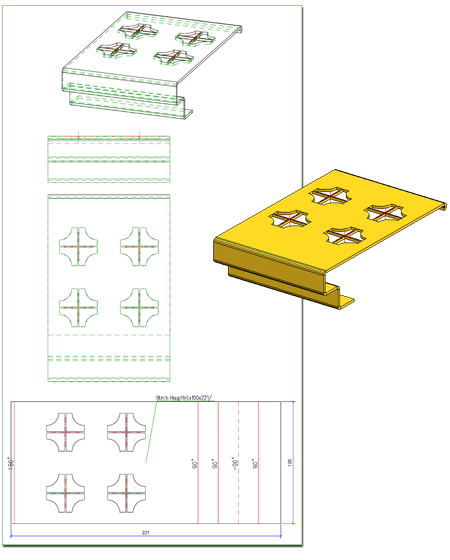 Ist die Option Darstellung mit Unterteilen aktiv, dann werden in der Abwicklung auch die einer Lasche untergeordneten Teile dargestellt, beispielsweise Schweißmuttern. Bei der Option Mit Werkzeug wird bei Stanzwerkzeugen die Spalte WZNR aus dem Katalog mit ausgegeben.