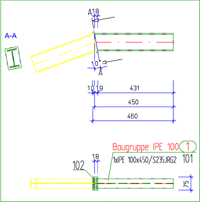 Bei Anbauteilen, beispielsweise stirnseitig angeschweißten Blechen, lässt sich automatisch die entsprechende Schnittansicht erzeugen. Die Blickrichtung der Schnittansicht ist von Profilmitte in Richtung des Blech-Anbauteils. Die Schnittlinie der Schnittansicht wird parallel zum Blech-Anbauteil erzeugt. Der Abstand vom Anschlusselement kann unter Abstand der Schnittebene angegeben werden.
