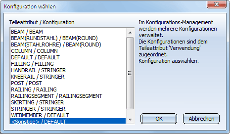 Neben der oben genannten Einstellungsmöglichkeit, können Sie für die Werkstattzeichnung auch Konfigurationen nutzen, die mit dem neuen ISD-Konfigurationsmanagement verwaltet werden. Diese Konfigurationen bieten über die Optionen des Dialogfensters hinaus weitere Möglichkeiten zur Erstellung individueller, kundenspezifischer Werkstattzeichnungen und sind dem Teileattribut Verwendungsart zugeordnet. Beispielsweise lassen sich so Verwendungszweck-abhängige Werkstattzeichnungen, z.B. für Träger, Stützen oder Riegel erstellen und individuelle Bemaßungsregeln für jedes Maß der Werkstattzeichnung definieren. Diese Konfigurationen sollten ausschließlich von einem Administrator erstellt und Ihnen zur Verfügung gestellt werden. ISD-seitig sind verschiedene Verwendungsart-abhängige Konfigurationen (z.B. Beam=Träger, Column=Stütze, RAILING=Geländer, HANDRAIL=Handlauf u.a.m.) vordefiniert: