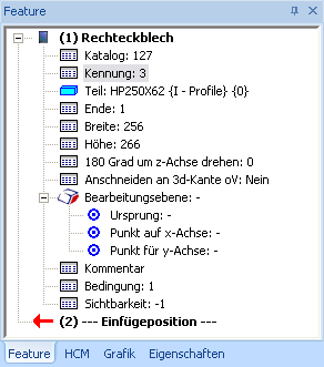 Auch bei Stahlbaukonstruktionen ist die Feature-Technik aktiv, d.h. in vielen Fällen wird der Konstruktionsschritt als Featureprotokoll aufgezeichnet. Während der Konstruktion hat der Zustand dieses Feature-Protokolls keinen Einfluss auf den Dialog oder den Konstruktionsablauf mit HiCAD.