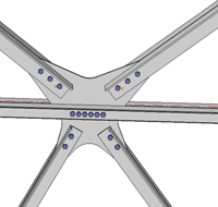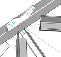 - Die in die Blechebene projizierten Achsen aller Anschlüsse schneiden sich in einem Punkt (Mittelpunkt), der auf der projizierten Achse der durchlaufenden Profile liegt.