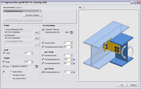 3. Das Dialogfenster Trägeranschluss gemäß DAST-IG, einseitig (308) wird angezeigt.