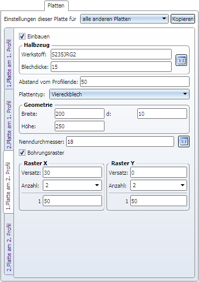 Für beide Verbandsprofile sind - jeweils für die 1. und 2. Platte - folgende Angaben möglich: