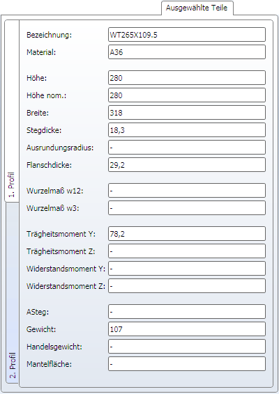 Hier werden Ihnen auf den Registerkarten 1. Profil und 2. Profil Informationen zu den zuvor identifizierten Profilen (Stützen) angezeigt, beispielsweise Art des Profils, Material, Abmessungen etc. Eingaben und Änderungen sind hier nicht möglich.