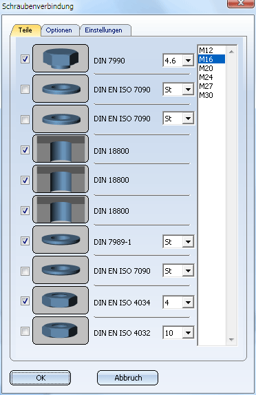 und wählen Sie im Dialogfenster Schraubenverbindung die gewünschten Komponenten.