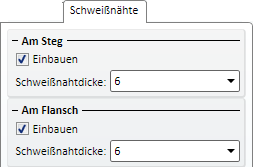 Auf dieser Registerkarte können Sie durch Aktivierung der entsprechenden Checkbox festlegen, ob an Steg und/oder Flansch Schweißnähte eingefügt werden sollen und wenn ja, welche Dicke die Schweißnaht haben soll.