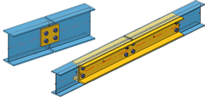 Diese Funktion verbindet zwei Profile durch einen biegesteifen - momenten-tragfähigen - Pfettenstoß mit beidseitiger Steglasche gemäß DAST PM. Als Steglaschen sind U-Profile oder Flachstähle möglich. Die Verbindung kann bündig erfolgen oder mit Spalt. Bei der Verbindung mit Spalt werden die Profile entsprechend verkürzt.