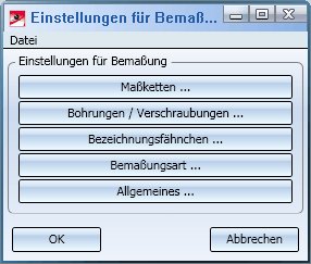 Nach dem Aufruf der Funktion wird zunächst das Fenster Einstellungen für Bemaßung angezeigt. Wählen Sie durch einen Klick auf die jeweilige Schaltfläche, welches Einstellungsfenster aktiviert werden soll.