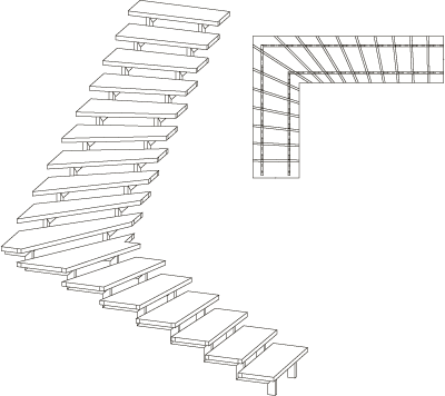 Im Unterschied zu geraden Treppen entstehen bei gewendelten Treppen gerade und verzogene Stufen.