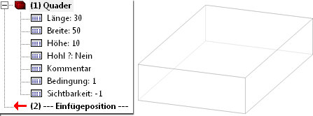 Dazu wird zunächst ein Quader ( Länge 30, Breite 50, Höhe 10) mit dem Namen Holm_bsp erzeugt. Achten Sie darauf, dass die Checkbox Feature