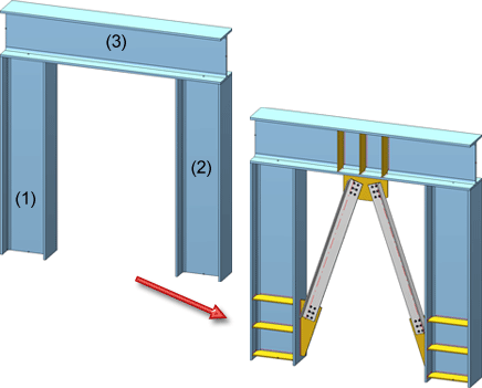 Mit den neuen Designvarianten für K-Verbände verbinden Sie drei Profile zur Aussteifung mit einem K-Verband. Die Knotenbleche können dabei mit den Profilen verschweißt oder über Montageplatten mit den Profilen verschraubt werden. Sie finden die Funktionen im Andockfenster Bauwesen-Funktionen unter Stahlbau > Anschlüsse > Steg/Flansch an Steg/Flansch.