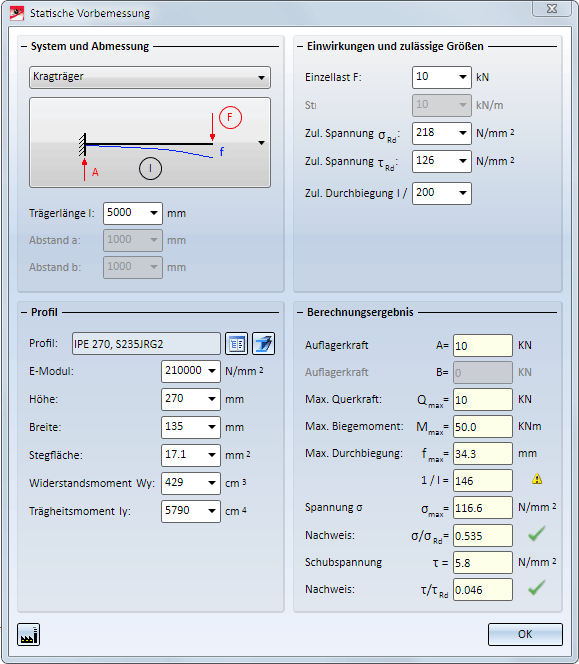 Mit diesem Berechnungstool, das die bisherige Funktion Berechnungen ersetzt, führen Sie statische Vorbemessungen für Stahl- und Metallbauprofile durch. Beispiele sind Kragträger mit Einzel- oder Streckenlast, Einfeldträger mit mittiger / nicht mittiger Einzel- oder Streckenlast etc. Sie finden die Funktion auf der Registerkarte Stahlbau unter Weitere Funktionen > Extras. (SP2)