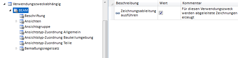 Die Erstellung von Ansichtsgruppen bei der Zeichnungsableitung (Werkstattzeichnung) kann in Abhängigkeit vom Verwendungszweck aktiviert/deaktiviert werden. Die Einstellung erfolgt im Konfigurationsmanagement (isdconfigeditor.exe) unter Automatische Zeichnungsableitung > Verwendungszweckabhängig > name, wobei name der Name des jeweiligen Verwendungszwecks ist, z.B. BEAM (SP2)