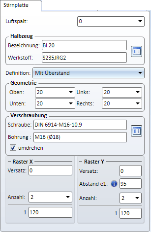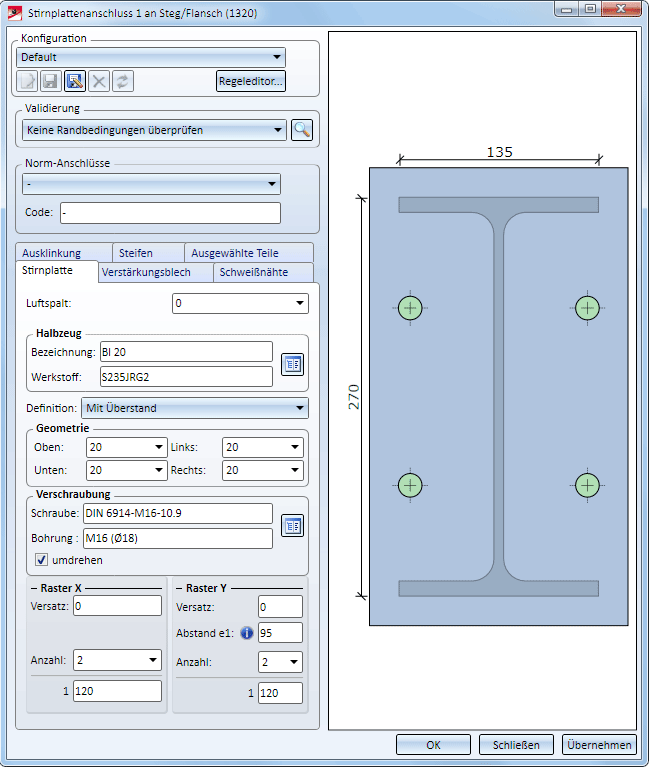 Das Dialogfenster für den Stirnplattenanschluss 1 wird angezeigt. Die Konfiguration des Strinplattenanschlusses erfolgt über die Registerkarten dieses Dialogfensters.