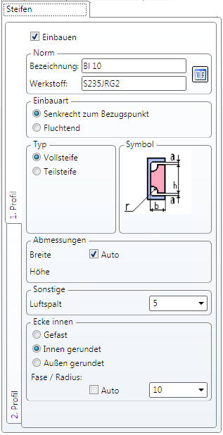Soll die Steife eingebaut werden, dann aktivieren Sie zunächste die Checkbox Einbauen und wählen Sie dann durch einen Klick auf das Symbol