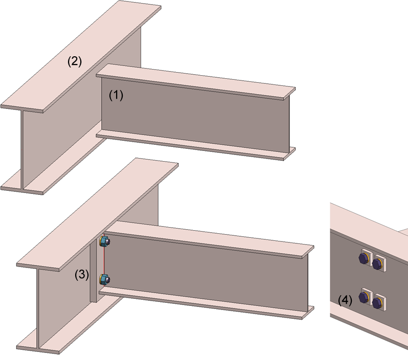 Mit dieser Funktion verbinden Sie Profile mit einem geschraubten Stirnplattenanschluss - mit oder ohne Steifen. Zusätzlich lassen sich auch Verstärkungsbleche an der Flanschseite des durchlaufenden Trägers einbauen.