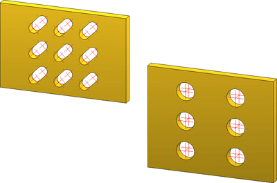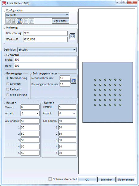 Mit dieser Funktion bauen Sie vorgebohrte Platten aus Blech oder Flachstahl ein. Dabei sind neben Normbohrungen auch Langlöcher sowie freie Bohrungen möglich.