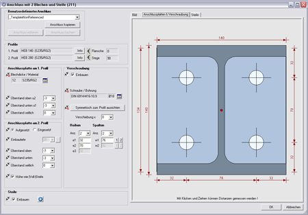 Hier werden zwei Profile durch zwei Bleche und - falls gewünscht - eine Steife miteinander verbunden. Die verlängerten Achsen der beiden Profile müssen sich schneiden.