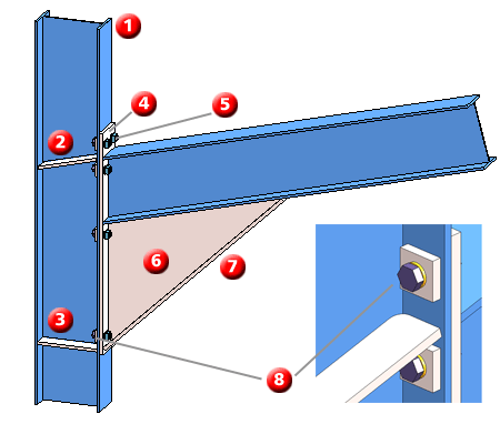 Mit dieser Funktion werden zwei Träger mit einer geschraubten oder geschweißten Rahmenecke verbunden, die sowohl mit als auch ohne Steifen und Vouten sowie weiteren Komponenten wie Unterlegblechen (Klötzchen) zur Stabilisierung der Verschraubung oder Stegverstärkungen eingebaut werden kann.
