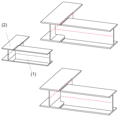 Die Ausklinkung erfolgt mit Verlängerung unter Verwendung der aktuellen Ausklinkparameter. Diese Parameter legen Sie mit der Funktion Stahlbau > Weitere Funktionen > Einstellungen Stahlbau fest.