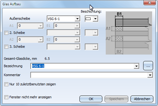 Zunächst bestimmen Sie durch Aktivierung der entsprechenden Checkboxen, ob die Verglasung aus einer oder mehreren Scheiben bestehen soll. Für jede Scheibe können Sie dann in der Listbox die gewünschte Glasart bestimmen. Die zur Verfügung stehenden Glasarten sind im Katalog WERKSTOFFE > GLAS definiert. Im Feld Beschichtung wird die für diese Glasart im Katalog definierte Beschichtungsart angezeigt. Ist der Glasart dort die Beschichtungsart einseitig zugeordnet, dann können Sie hier wählen, ob die Beschichtung oben oder unten erfolgen soll.